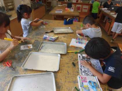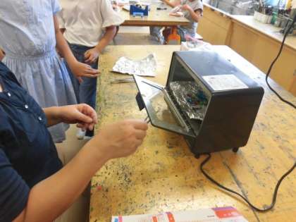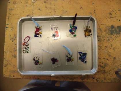 プラ板に好きな絵を描き、マジックで色を塗り、トースターで焼きました。プラ板が焼ける間、ドキドキしながらトースターの中を覗き込んでいました。できたてほやほやのプラ板を大事そうに手にとり、紐を通して仕上げました。