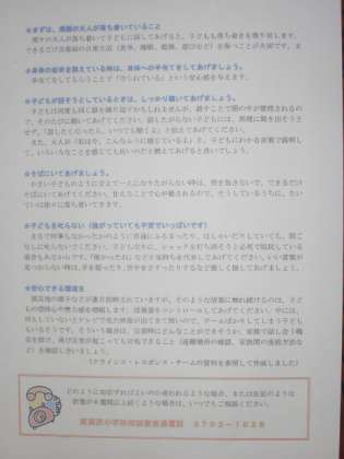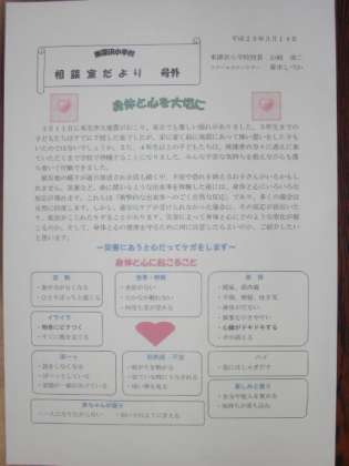教育相談室のスクールカウンセラー笹木先生が、今回の大地震を受けて、子どもたちの心や体を大切にしたいとの願いから「相談室だより 号外」を発行しました。