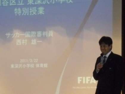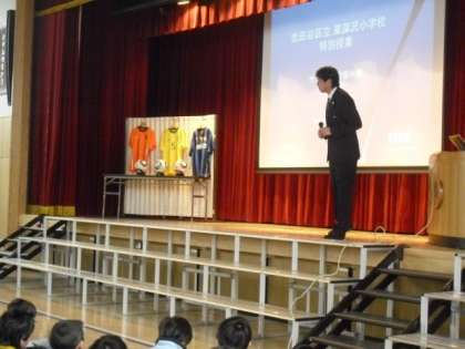 西村先輩から、先輩の東深沢小学校時代のお話や審判のお仕事、サッカーワールドカップでのお話をたくさんいただきました。昨年の南アフリカ大会で実際に使用したボールや選手のユニフォームなどお宝もお持ちいただきました。サッカーボールには試合をするチーム(国名)と月日が書いてあります。子どもたち全員にボールに触ってもらいたいと3つのボールを回した時には、子どもたちは大興奮でした。