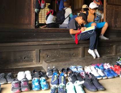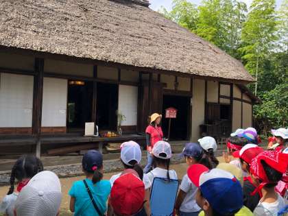 次大夫堀公園に着きました。古民家では昔の暮らしについてお話を伺いました。敷居をまたいだり靴をそろえたりというマナーも意識して見学できました。
