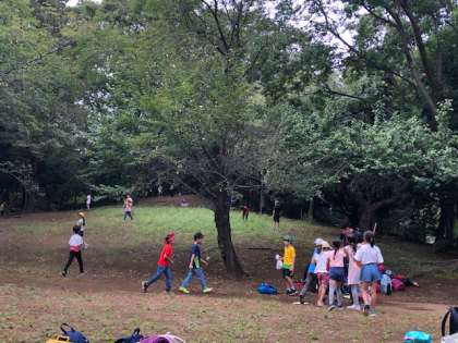 等々力渓谷は、先日の台風や昨日の大雨での倒木や枝折れの復旧作業が続いているため、見学を中止にしました。その分、次大夫堀公園で、たっぷり見学したり遊んだりできました。少し早く帰校しますが下校時刻に変更はありません。