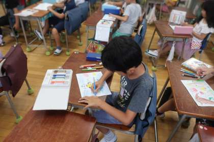友達の描いた線や模様から自分のイメージをふくらませ、続きの絵を描いていきました。どんどんリレーし、絵を完成させました。