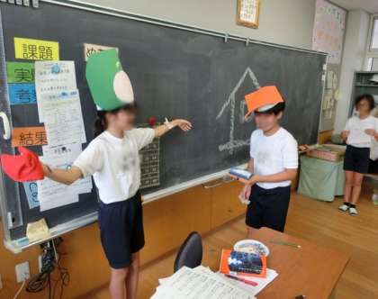 6年生では国語「まほう使いのチョコレート・ケーキ」の学習の一環で、劇をしました。教科書に載っている物語の続きをグループごとに考えて、演じました。