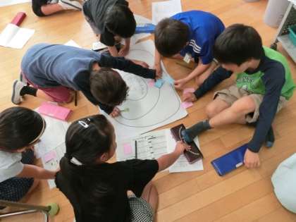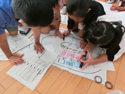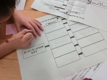 そこで見付けてきたお客さんに商品を買ってもらうために工夫していることをグループで出し合い、模造紙にまとめました。
