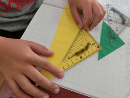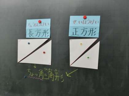 標識から形を探したり、折り紙を切って作ったりして、直角三角形を学習しました。