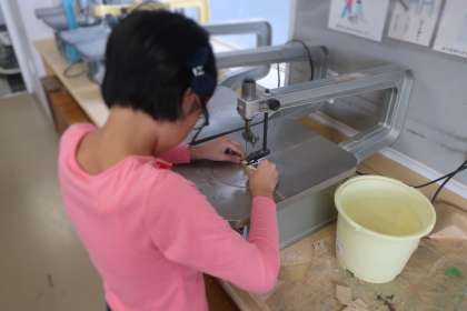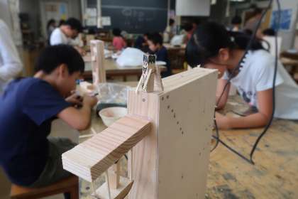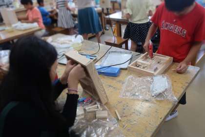のこぎりや金づち、電動糸のこぎりやグルーガンを使って、自分だけのツリーマンションを作ります。