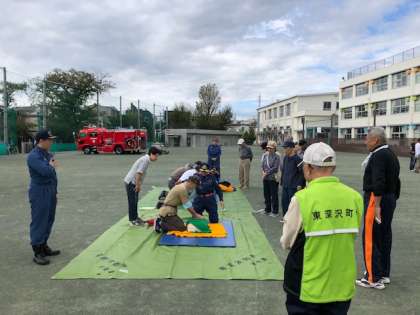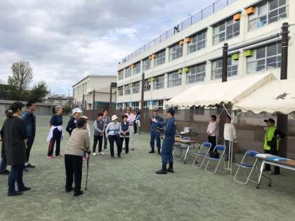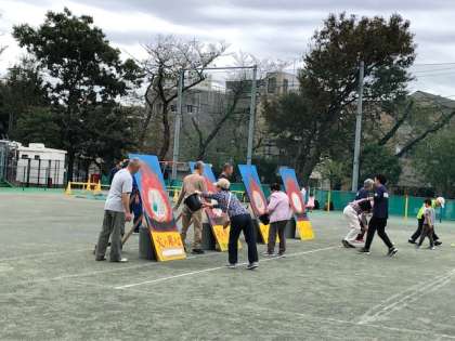 校庭で、町会の防災運動会が開かれました。地域の皆様や消防署、消防団の方々と一緒に子どもたちも消火器訓練やAED使用体験そしてパン食い競走などを楽しみました。