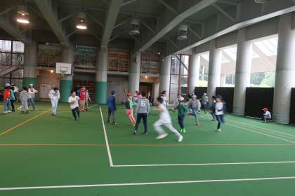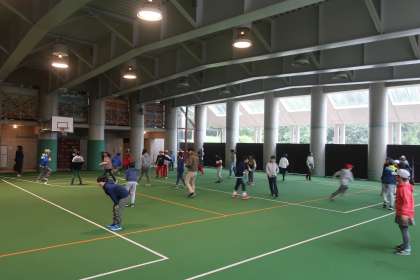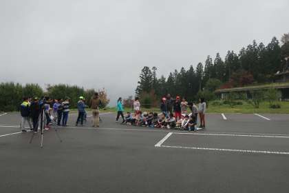 ビレジの建物をバックに、クラスの集合写真を撮りました。