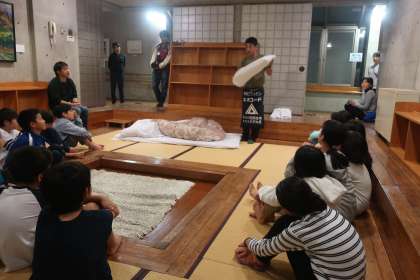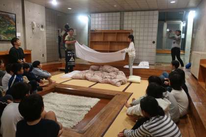 整頓係が集まって、明日の朝の布団の片付け方を教わります。
