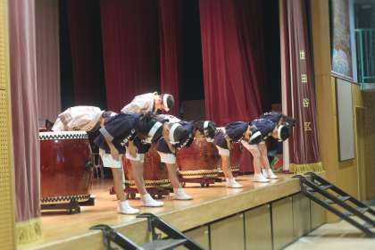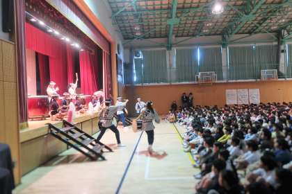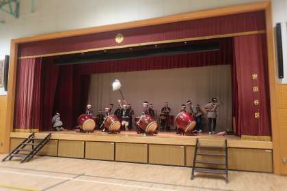 今日の全校朝会は、表彰と高進太鼓チームこざくらの演奏でした。