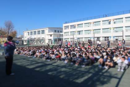 今日の避難訓練は、主事室から出火し、放送設備が使えないという想定で行いました。