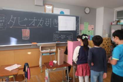 学年集会として、4クラス合同で楽しいお店屋さんを出しました。