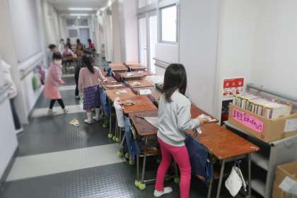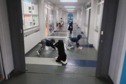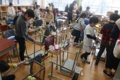教室や廊下、机や椅子、靴箱など大掃除です。