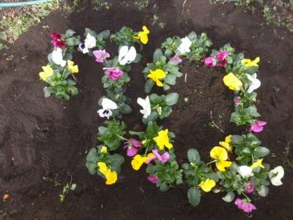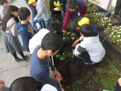 栽培委員会による創立70周年記念イベントとして、パンジーなどの苗24株で花壇に「70」の文字をつくりました。各学級の代表者が一株ずつ植えました。