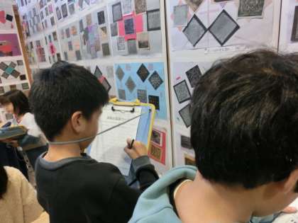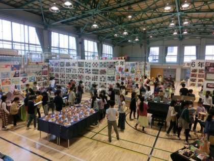 展覧会の児童鑑賞を、3・4年生合同で行いました。それぞれの学年を見合ったり、高学年の作品を見たりしていました。2学年とも落ち着いて鑑賞することができていました。