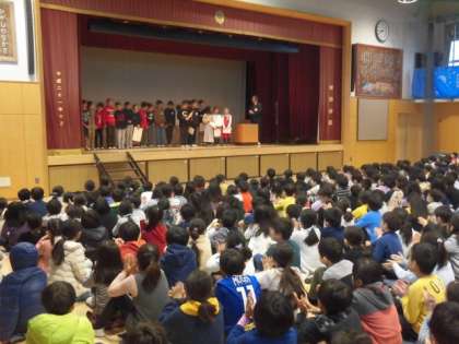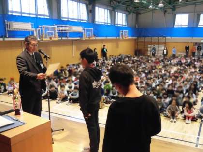 体育館で全校朝会がありました。野球チームやバスケットボールチーム、地域のかるた大会で活躍した児童らが表彰されました。