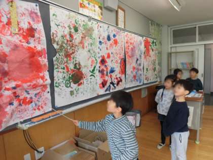 1年生の教室では、図工で工作をしたり、色の重なりの良さを鑑賞したりしていました。