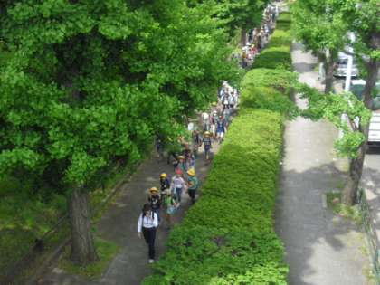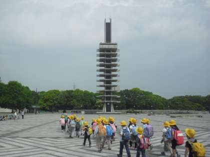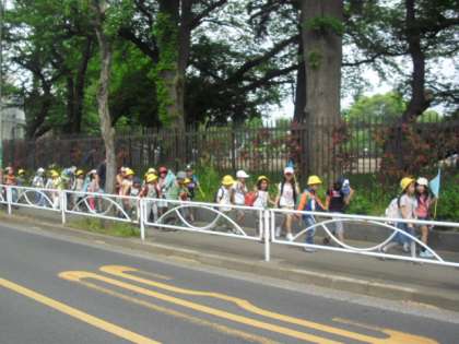 1,2年生の遠足は駒沢公園です。2年生が班長さんになって1年生をリードしながら学校から歩きます。天候が心配されましたが曇り空で歩きやすいです。
