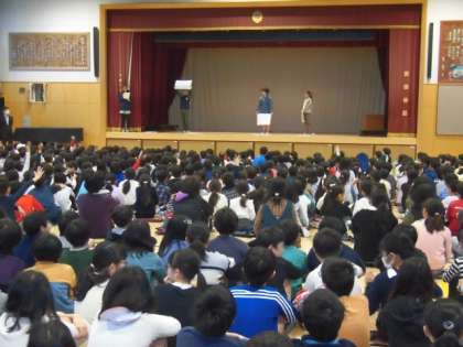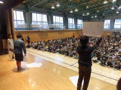 児童集会がありました。集会委員会が体育館で、イントロクイズを出しました。選択肢が工夫されており、みんなが楽しんでいました。
