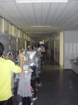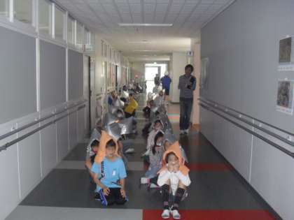 今日の避難訓練は、「主事室から出火中央階段が使用できない」という想定で行いました。あいにくの雨なので、校庭へは避難せずに廊下までの避難でした。避難訓練の放送がなると、1階から3階まで物音ひとつしません。教室から廊下へ移動するときも真剣そのものです。全員の避難の確認後、校長先生から話をしました。