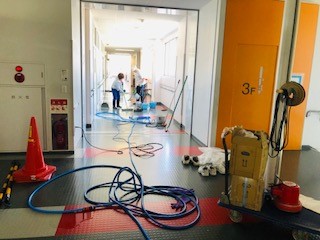 1枚目は、主事さんが廊下にワックスをかけているところです。みなさんが学校に来た時に、きれいな校舎で迎えられるように準備をしています。