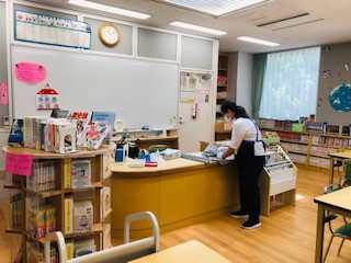 2枚目は、図書室の様子です。図書司書さんが、みなさんに本の貸し出しができるように準備を進めています。