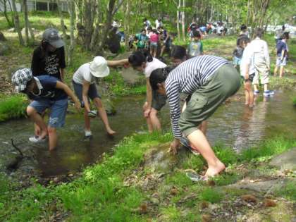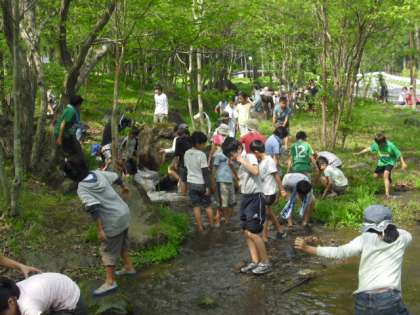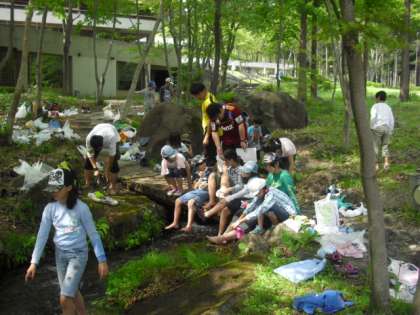 登山からビレジに戻ったのは14:00です。予定より30分早く行動ができたので、特別プログラム「川遊び」です。ビレジ前の小川の水の冷たさにびっくりです。それでも元気に遊びます。ここでも自然の恵みに接しています。
