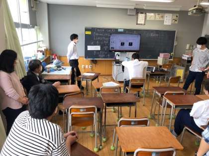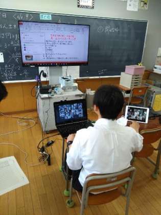 写真(しゃしん)は、今日(きょう)、4年生(ねんせい)から6年生(ねんせい)までの代表(だいひょう)クラスで行(おこな)ったZoom(ズーム)を使(つか)った朝(あさ)の会(かい)の様子(ようす)です。思(おも)っていた以上(いじょう)にたくさんの子供(こども)たちが参加(さんか)することができて驚(おどろ)きました。そしてチャットでは「ありがとう」「会(あ)えて、うれしかった」という喜(よろこ)びの声(こえ)をたくさん聞(き)くことができました。先生方(せんせいがた)が周(まわ)りでうまくいくようにと応援(おうえん)していました。