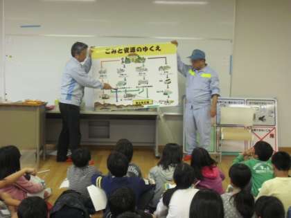 まず、家庭から出されるごみの分類の仕方をクイズ形式で学びました。次に、最終処分場が、あと50年でいっぱいになってしまうという話を聞き、家庭でごみを減らす工夫も教えていただきました。