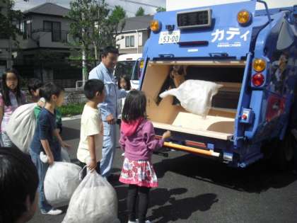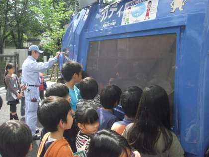さらに、体験学習用ごみ収集車(カティ)に一人一人、実際にごみを入れ、そのゴミが荷箱の中でどのようになるか、荷箱の横にあるスケルトンの窓からのぞきました。収集車の中が「こんなふうになってるんだ」と、子どもたちも興味津々でした。(4年担任 百瀬)