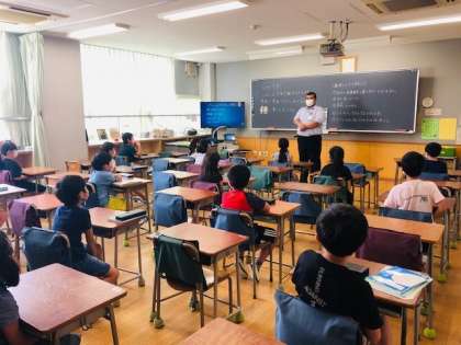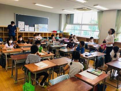 写真(しゃしん)は、昨日(きのう)の3年生(さんねんせい)の様子(ようす)です。授業(じゅぎょう)ではお互(たが)いに自己紹介(じこしょうかい)をしていました。担任(たんにん)の先生(せんせい)だけでなく、少人数算数(しょうにんずうさんすう)の先生(せんせい)やペア学年(がくねん)の先生(せんせい)の紹介(しょうかい)クイズもしていました。マスクをしていて笑顔(えがお)が見(み)えなくても、目(め)が笑(わら)っていて楽(たの)しそうな様子(ようす)が伝(つた)わってきました。