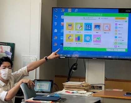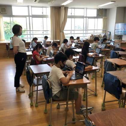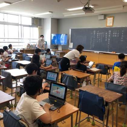 写真(しゃしん)は、4年生(よねんせい)がタブレットを使(つか)って、キーボードゲームをして、タイピングの練習(れんしゅう)をしているところです。とても集中(しゅうちゅう)して静(しず)かに取(と)り組(く)んでいて驚(おどろ)きました。ペア学年(がくねん)の先生(せんせい)も来(き)て、分(わ)からないところがあるとすぐに教(おし)えていました。