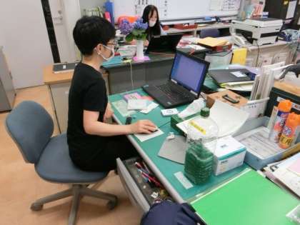 1枚目の写真は保健の先生の写真です。みなさんが少しでも安心して学校に通えるようにどういったことができるかおそくまで考えています。