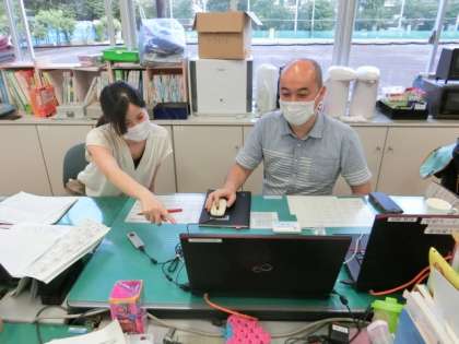 2枚目の写真は先生たちが来週の授業の内容をどうしたらよいかを相談している様子です。時には意見がぶつかることもありますが、それはひがしの子たちを思うがゆえの結果なのです。