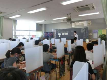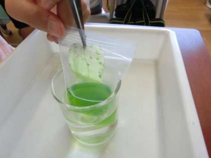 オシロイバナの葉を使って、植物と日光の関係を調べました。エタノールで葉の色を落とした後、ヨウ素液につけると青紫色に葉が変化するものがありました。児童は、その様子を観察して驚きの声をあげていました。(T,S)(S,N)(K,K)(H,H)