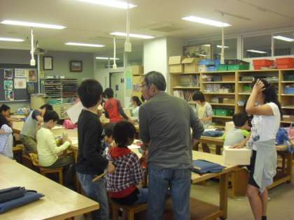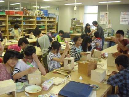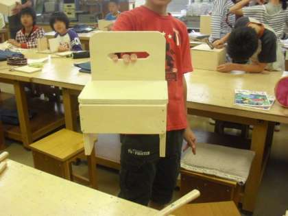 1枚の板を切ったり組み合わせたりしながら、イスや箱を作ります。どんな思いでのこぎりをひいたり、釘を打ったりしているのでしょう。「校長先生見て」と差し出された椅子には、子どもの思いがぎっしり詰まっています。