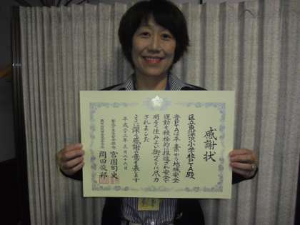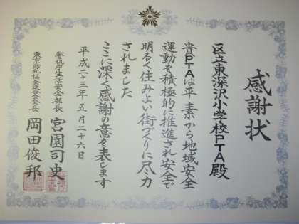 玉川警察署で「地域安全運動」を推進しているということで、東深沢小学校のPTAが表彰されました。普段から子どもたちの登下校を見守ったり、警察と協力して地域の安全点検をしたりしている活動が認められました。この賞状は、東深沢小学校の宝ものです。