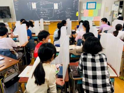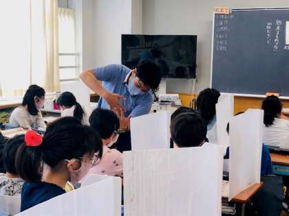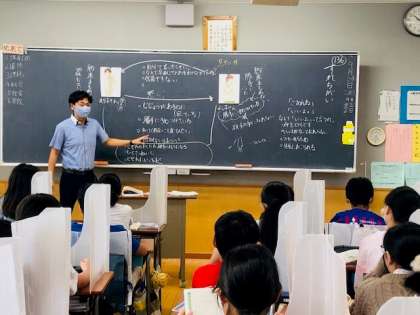 授業の開始は「先生劇場」。教師の一人芝居を、児童は笑顔で見つめていました。