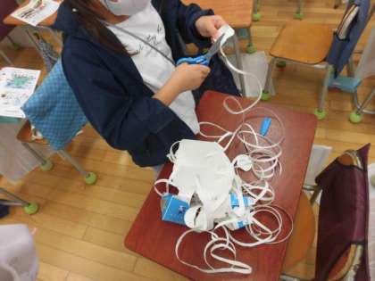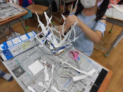 2年生の図工(ずこう)の「切(き)って、ひねって、つなげると」の学習(がくしゅう)では、牛乳(ぎゅうにゅう)パックや紙(かみ)コップを切(き)り、ホッチキスでとめて作品(さくひん)をつくりました。