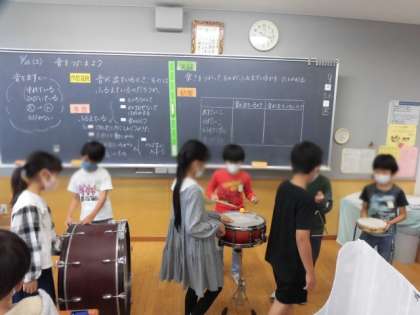 大太鼓、小太鼓、トライアングル、タンブリンの音を鳴らし、実際に触って確かめました。