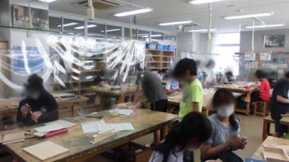 大きく変わったところは、コロナ対策のパーテーションをすべての机に付けてもらい、対面での活動ができるようになったことです。これは主事さんの協力により実現しました。また、密集を避けての学習スペースとして、廊下にパネル掲示や材料置き場を設けて活用するようにしています。