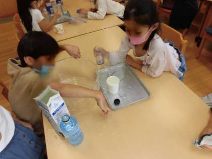 今日(きょう)はランチルームで、様々(さまざま)な身(み)の回(まわ)りのものの水のかさを、リットルますやデシリットルますを使(つか)って調(しら)べました。