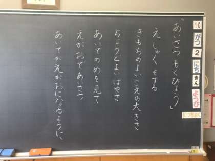 来週からあいさつ運動が始まります。子供たちと、どのようにあいさつをするとよいか話しました。その中で『笑顔で』『相手が笑顔になるように』という意見が出たので、“笑顔のあいさつで、相手も笑顔にする”を目標にすることになりました。笑顔がたくさん見られるといいです!(O.M)(W.M)