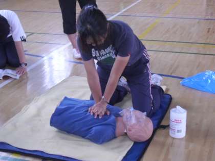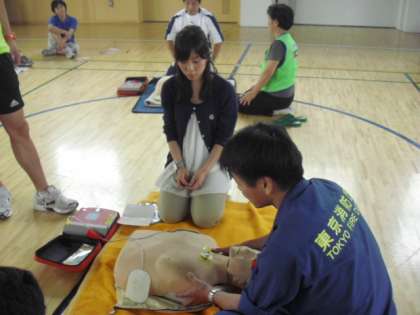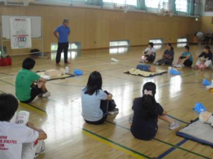 先生方は、心肺蘇生法・AEDの使い方・止血の方法などの応急措置を学びました。毎年行う講習ですが絶対に事故を起こさないという意識で臨みました。