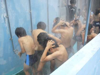 冷たいシャワーでも声を出さずに浴びた1組男子は、立派です。