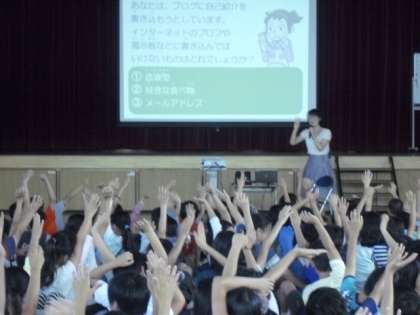 4〜6年生のセフティー教室は、携帯電話の安全な使い方でした。携帯電話を使ったことがある子どもがほとんどという高学年は、インターネットやメールの安全な使い方を、クイズを解きながら考えました。未知の世界や便利な道具に興味津々の子どもたちですが、インターネットやメールの便利さに潜む危険を知りました。今後の生活に活かせるようにご家庭でも話題にしていただけるよう、お願いいたします。(6年担任遠藤)