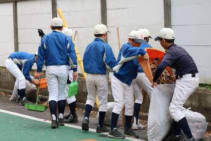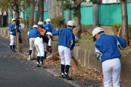 朝から東深沢小学校をホームグランドとして活動している少年野球チーム”東深沢ジャーガーズ”の選手やお母様たち(40名程)が、学校周辺の落ち葉掃きをしてくれました。この活動は毎年実施されています。きれいにしてくれて、ありがとう!(T.S)