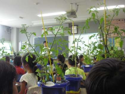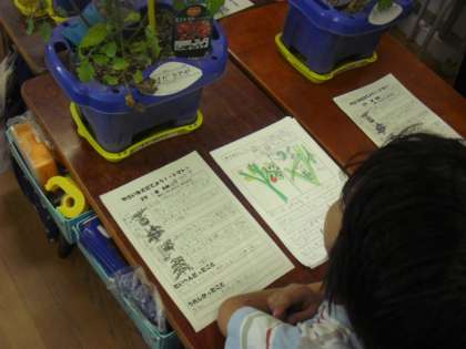 校内研の研究授業2年生「やさいを育てよう!<トマト>」です。自分で育てているミニトマトの生長の過程を振り返って、野菜を育てる工夫や苦労を学びます。学習を通して食材や野菜を育てる人への感謝する気持ちも培っていきます。