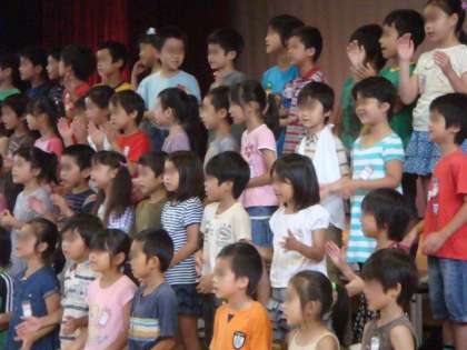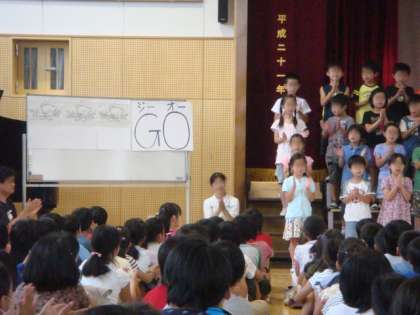 2曲目はリズムに乗って「ビンゴ:BINGO」。「・INGO」「・・NGO」と抜いたところは手拍子をします。だんだん抜くところを増やしながら、学校全体で楽しむことができました。