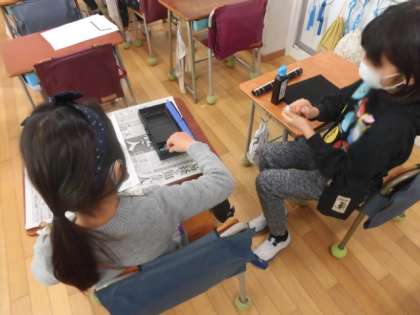 2年生と5年生の異学年交流(いがくねんこうりゅう)で「習字(しゅうじ)」の学習(しゅう)を行いました。